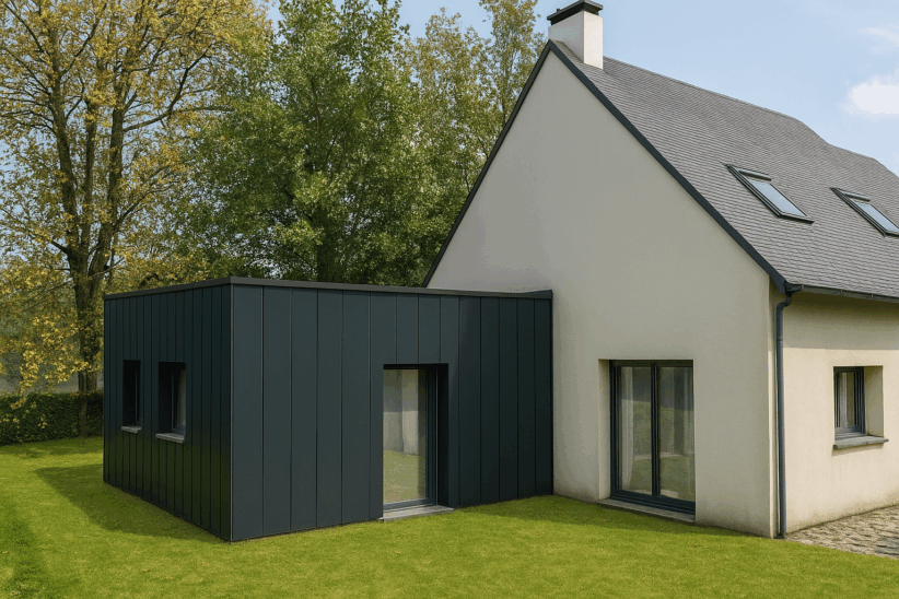 Cette extension se veut cubique pour apporter du modernisme à ce pavillon classique. L’habillage de cette extension est en zinc joints debout, matériaux à la fois esthétique et moderne. Le zinc offre de nombreux avantages : Il permet une excellente étanchéité et ne craint pas la corrosion, le zinc résiste parfaitement aux chocs thermiques pour un confort optimal été comme hiver.