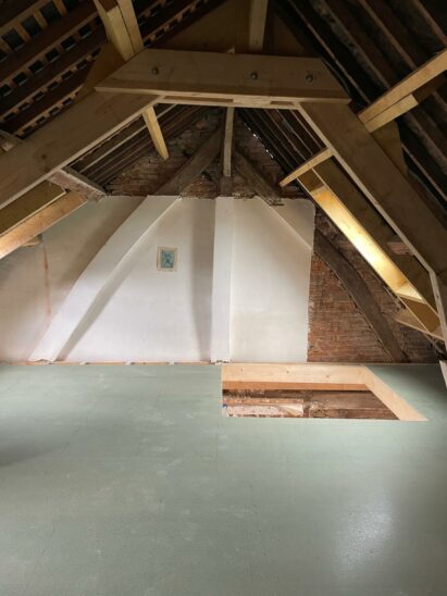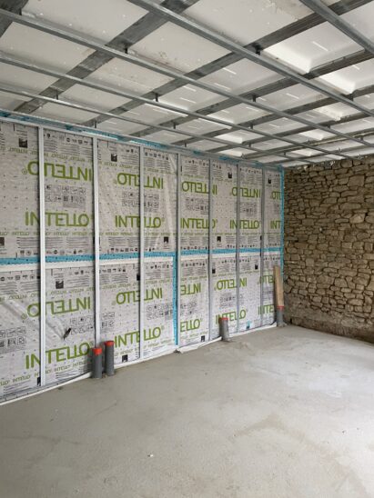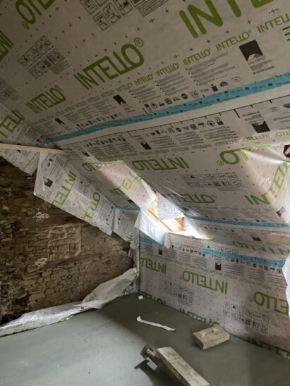 On n’oublie pas la mise en œuvre d’une VMC Hygro B avec gaines semi rigides : primordial dans une rénovation de grande ampleur pour garantir une bonne ventilation et la santé de ses occupants.