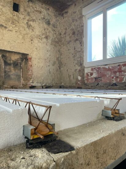 Tous les murs périphériques ont donc été isolés par l’intérieur, ainsi que la toiture terrasse. L’ancien plancher bois a été supprimé et remplacé par un plancher hourdis isolé. Une VMC a été mise en œuvre.
