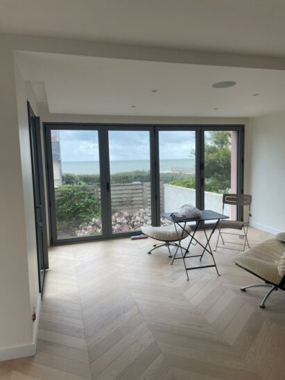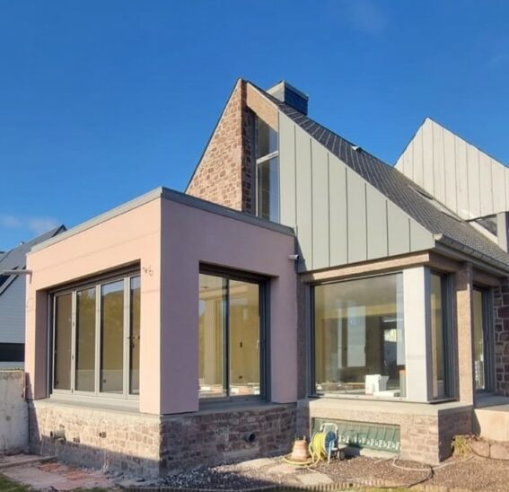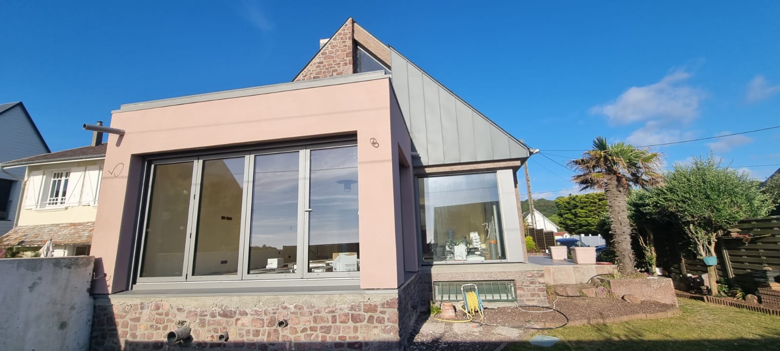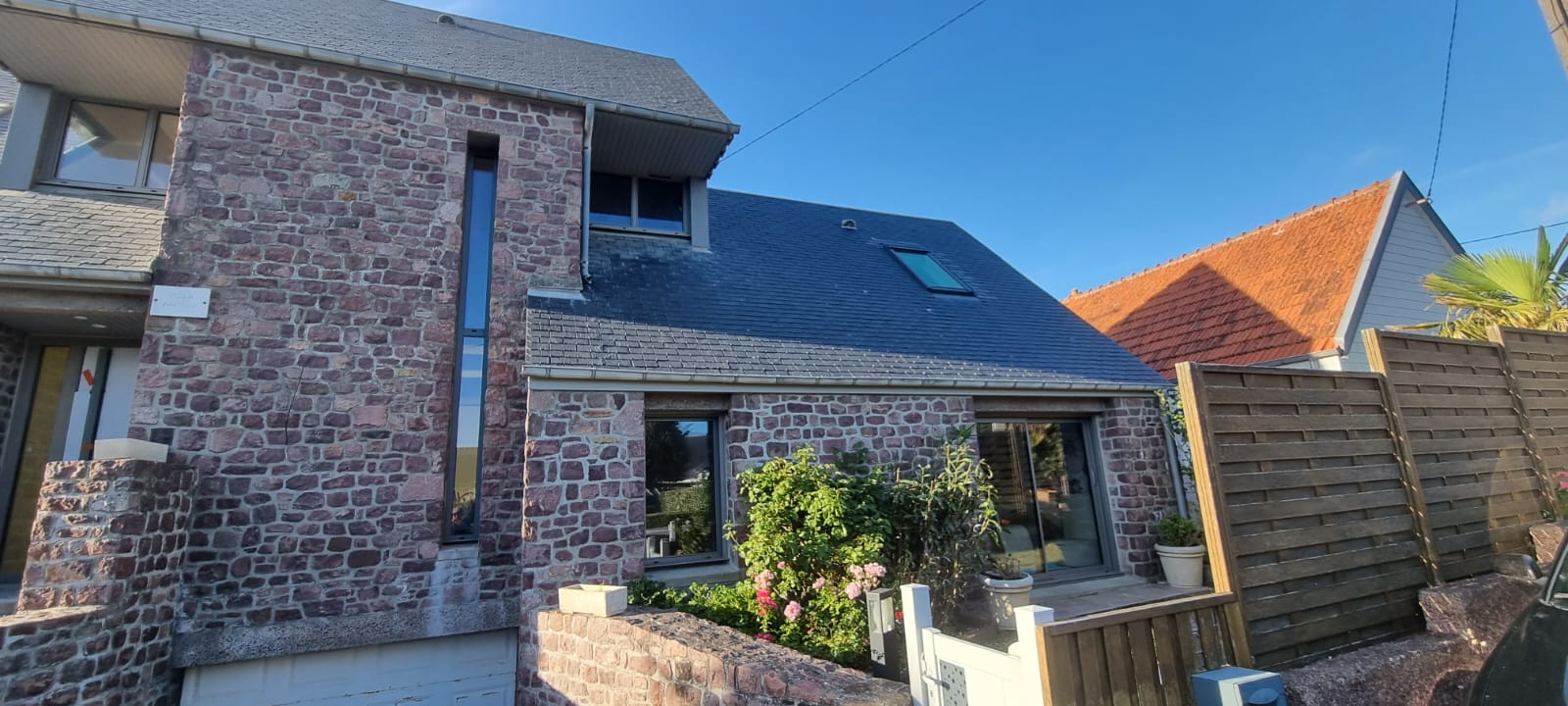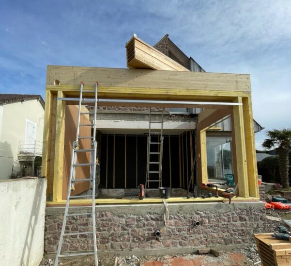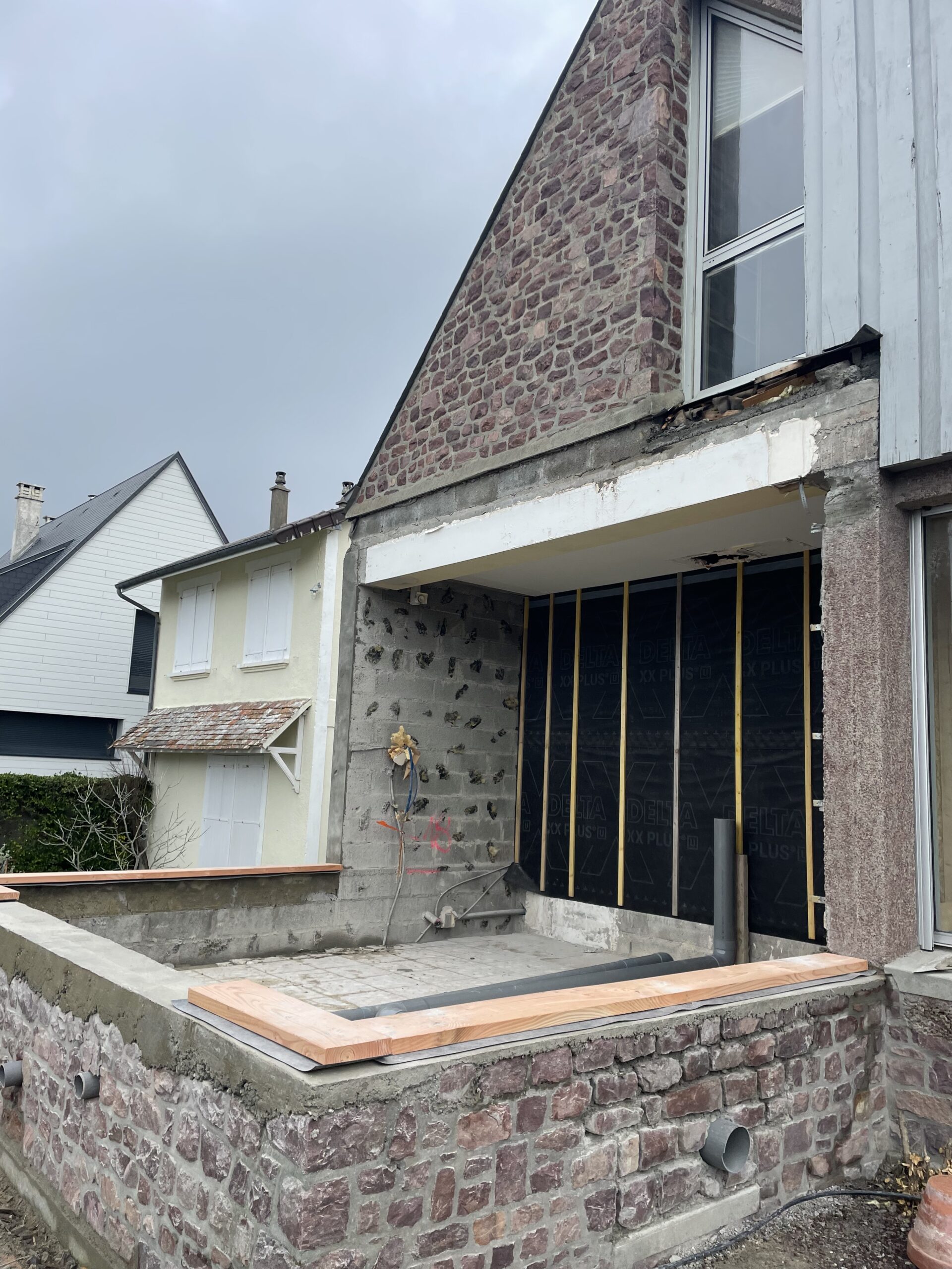 Nous avons donc démoli un salon en contrebas et crée une extension, pour être dans le prolongement du séjour existant. Cette extension a été réalisée en ossature bois. Le mur intermédiaire a été supprimé.