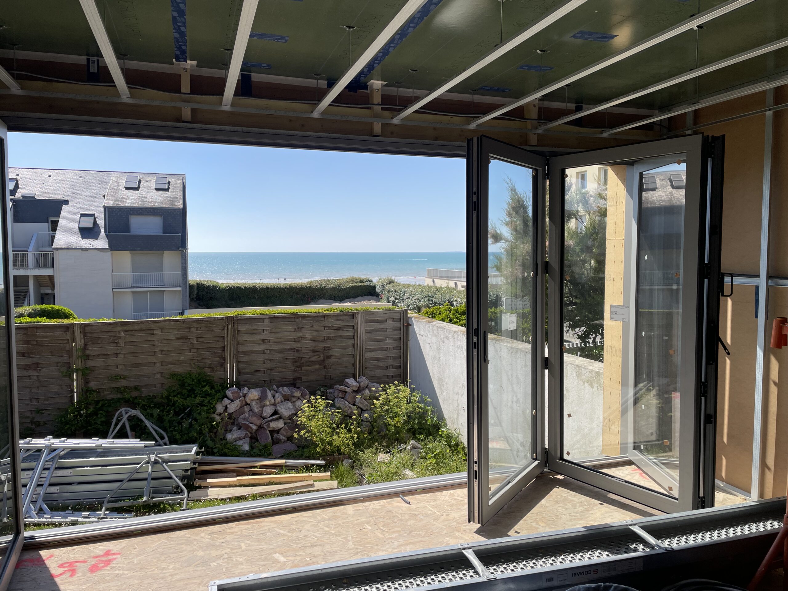 Une baie « accordéon » permet de créer une véritable fusion entre l’intérieur et l’extérieur : lorsque la porte est ouverte les différents éléments de la baie se replient vantail contre vantail pour n’occuper qu’un minimum d’espace, et ainsi garantir une vue imprenable.